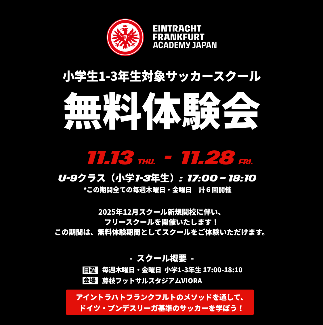 ドイツ・ブンデスリーガクラブの公式育成組織として活動するアイントラハトフランクフルトアカデミージャパンのコーチングスタッフが直接指導するサッカースクール!